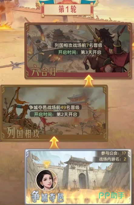 整个玩法划分为三级战场体系,由低至高依次为:争城夺邑、列国相攻、六合归一。所有公会均从初始战场“争城夺邑”起步。该阶段为全员准入层级,无门槛限制。后续晋级严格依据公会实时表现评分,达标者方可升入更高难度战场。