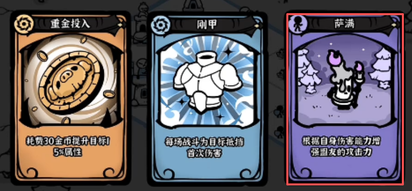 接下来还有萨满,萨满这张职业卡的话,其实很多玩家都是没有用过,因为他在这里的话,有一个功能是根据自身的伤害能力来增加目前盟友的攻击能力,所以一般他是要跟其他的卡牌进行组合作战,所以大家一定要挑选到自身输出强度比较高的卡牌,跟萨满一起组合作战,可以带来的整体战力才会比较高,最后还有一个轰炸者,轰炸者目前的强度也是非常高的,是一张红卡,正面冲向敌人的情况下就可以带来爆炸性的输出,而且在这里也是造成范围类型的攻击效果,所以如果敌方单位聚集在一块儿的情况下,大家就可以选择用轰炸者这张职业卡来对敌人进行范围轰炸。