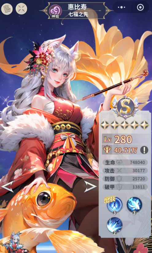 除了这两个特定的诸神角色之外,游戏当中诸神阵营里面也有各种分支的角色,大家也可以使用,比如惠比寿在当前的神姬效果当中,惠比寿可以召唤海洋之力来吞噬目标,如果目标当前生命数值百分比小于10%的情况下,那么她就会吞噬这个目标之后限定敌人的行动,否则的话,在这里如果是对面生命数值比惠比寿高的话,她只会带来280%的物理伤害,另外,被动技能就是可以让她来强化我方的全体角色,惠比寿只要在场就可以提升我方全体8%的防御效果,后期召唤出来的海洋成功吞噬敌人之后,还可以永久提升自身10%的伤害减免,最多的情况下,这里伤害减免是可以提升到40%的,除了这里惠比寿的各种抗性效果非常好用之外,她的吞噬能力大家可以当做一类克制能力使用。