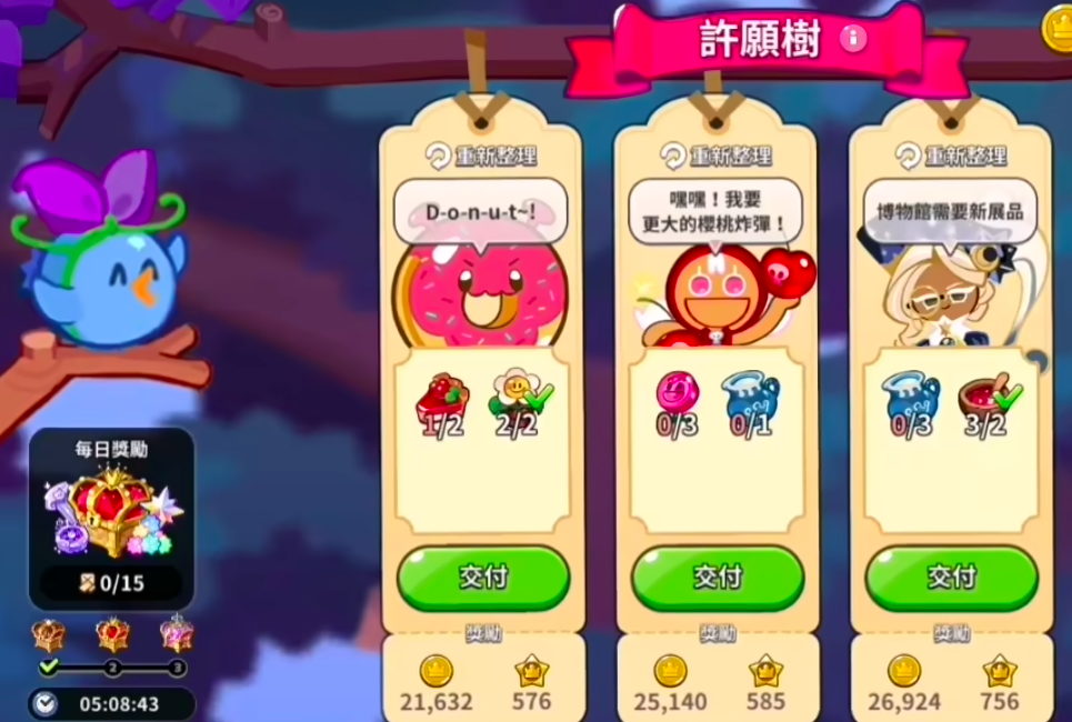 除此之外,蓝莓鸟的宝箱获取方法还有另外一种,玩家在地图当中碰见蓝莓鸟后可以直接点击触发,此时就会自动跳转到许愿树这一界面。玩家完成蓝莓鸟的相关订单需求可在许愿树当中与蓝莓鸟兑换礼物,目前在许愿书当中的订单包括草莓酱、牛奶、樱桃棒棒糖、幸福花等一系列资源。