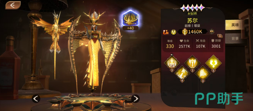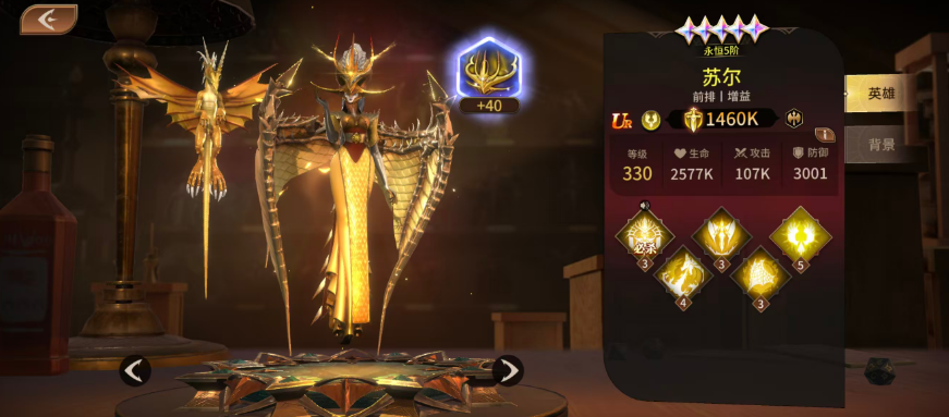 最后大家推荐的是一个前排角色,叫做苏尔,苏尔他的增益效果确实是非常强势,在这里通过必杀功能可以快速的让自己进入觉醒形态当中,觉醒形态当中的他可以带来攻击提升,而且是有基础55%的提升效果,此时让场内苏尔的攻击变成范围伤害,每秒虽然会消耗百分比较高的能量值,但是在能量值耗尽了之后,觉醒形态也会解除,可以用普通形态当中的攻击对敌人进行输出,所以这里的苏尔大家也不用担心能量消耗完毕怎么办,后期绝技效果对场内可以带来一个光焰输出范围,当中的敌人都可以受到这里170%的攻击伤害,而且在攻击伤害完毕之后,他还可以恢复自身170%攻击能力当中的生命恢复,所以苏尔他带来的此类功能可以保证自己在场内不断的存活下去,因为他这个技能的冷却时间后期是可以通过升级而降低的,所以多频次的回复可以提升他最强的生存能力。