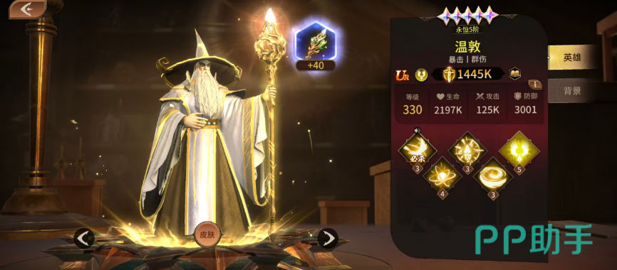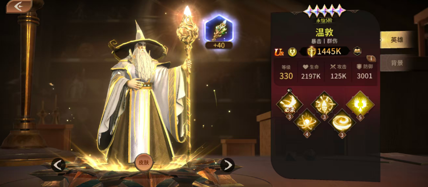 第二个为大家推荐的叫做温敦,温敦这个角色不仅暴击非常的强,群伤也非常好用,在这里可以召唤出一个非常大的魔法神鹰,在场内对于敌人造成200%的基础攻击,同时只要命中敌人的情况下,还可以附加神鹰威压,这里神鹰威压施加成功,那么敌人在场内攻击的速度就会降低15%,同时暴击的概率也会降低15%,所以对于敌人来说,他的减伤能力是非常强势的,而在绝技效果当中,温敦可以找到随机一名对手,对他以及周围的敌人造成200%输出的时候,后期还会产生足够的暴击,暴击一旦触发,对全体的敌人可以额外造成80%的攻击伤害,那么被命中的敌人,他自身的属性当中的命中概率会降低20%的效果,所以如果此时敌人我方角色进行输出,那么我方闪避成功的概率是非常大的,后期在暴击概率上面还可以通过被动来提升,此时他攻击能力提升了以后,效果也是不可以被对面给驱散掉,所以他自身用到的各种能力很容易触发的同时,也不容易被对面给控住。