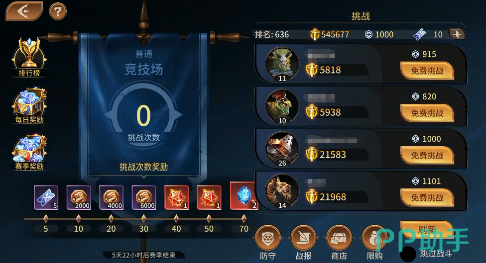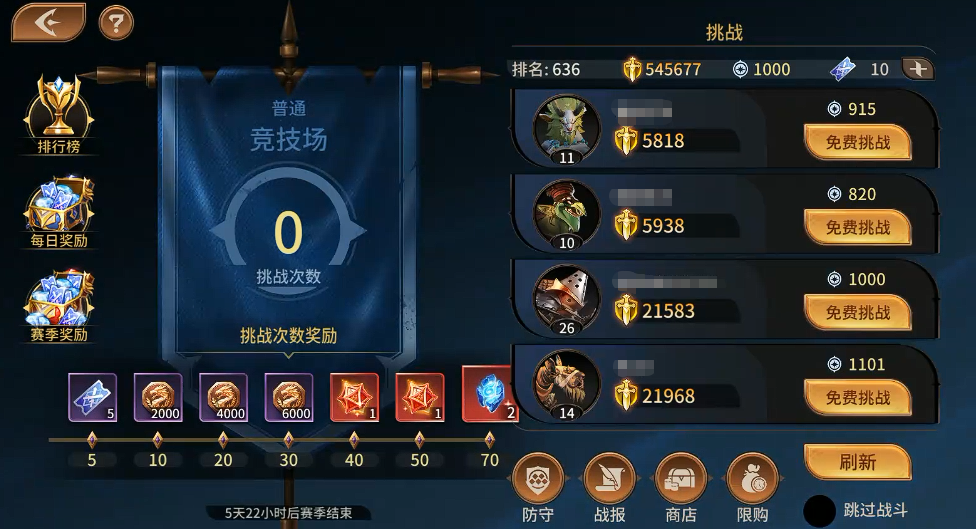 还有竞技场,目前在4-15这个关卡完成了之后,大家也可以开启参与其中的PVP玩法,每周是固定只能进入70次,那么分担到每天的话,基本就是玩家一天可以参与10次,10次如果全部参与成功的话,在其中还可以领取一个全量挑战的奖励,这个奖励是每天玩家都打满这个次数才可以拿到的,而且如果竞技场里面大家强度非常高,得到了段位加成,每天都可以根据其中的段位给大家发放钻石以及竞技场币之类的资源,通过第二天的邮箱拿到这些资源之后,大家还可以去竞技场商店兑换自己想要的更多材料。