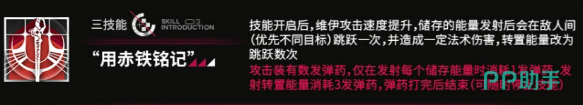 三技能「用赤铁铭记」为弹药限定型技能,共提供27发弹药。技能期间攻速大幅提升,估算增幅达+200,实现约1秒1球的生成节奏。普通储存能量发射后可在至多2个敌人间弹射;转置能量则具备更强扩散性,推测可弹射5次。消耗方面:发射1单位储存能量需1发弹药,发射1单位转置能量则需3发弹药。在伦蒂尼姆城防自行炮与萨卡兹战士的混合测试环境中,群体输出稳定超过10万;若聚焦单体并最大化弹射链,理论峰值伤害可突破15万——受限于演示目标血量偏低,具体数值尚待更多实战验证。