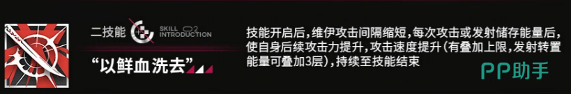 一技能「自呼号生发」为自动触发型常驻技能,专注提升攻速。结合模组Y增益,理论攻速增幅可达+100,平均约每1.5秒生成1单位储存能量。适用于低操作压力场景,挂机即可稳定运转,兼顾效率与便利性。