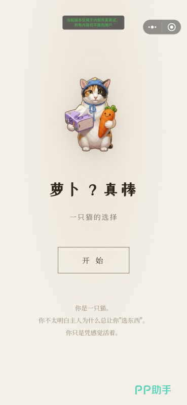 目前官方尚未公开任何有效兑换码。建议玩家提前通过正规渠道预约游戏,待正式上线后第一时间获取更新资讯及可能开放的兑换入口。作为一款强叙事驱动型作品,《萝卜真棒》巧妙融合魔性表情包元素与可交互剧情,让日常物品如萝卜、小鱼干、纸巾等成为推动情感与结局的关键变量。