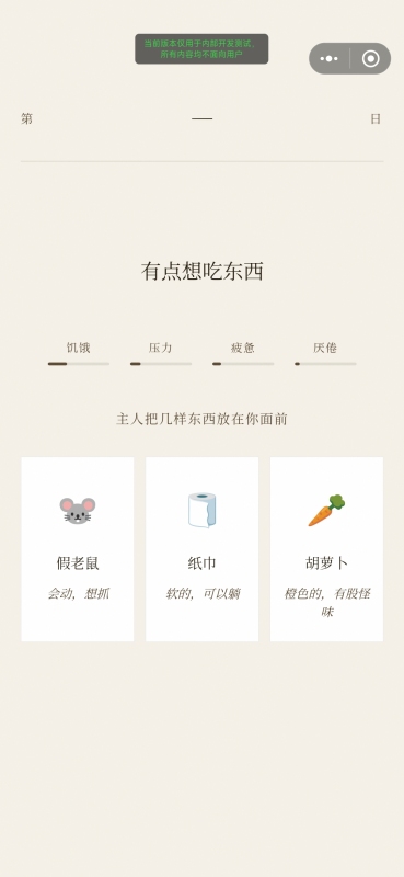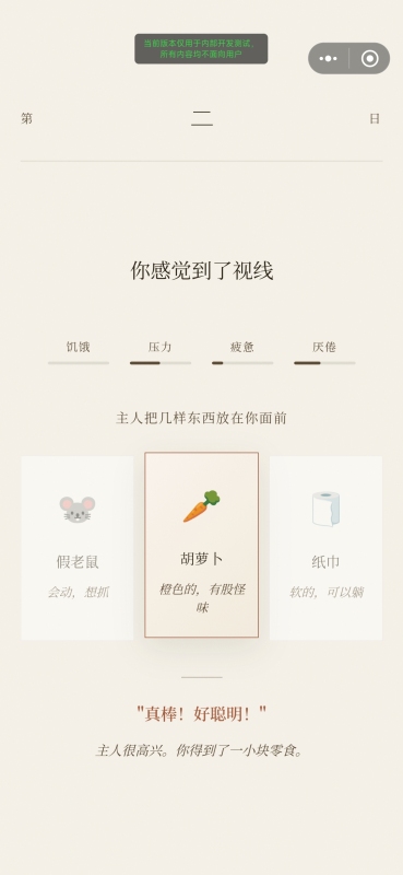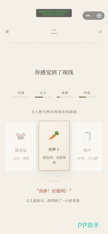玩法机制简洁直观:主人随机摆放物品并下达指令,玩家需在限定时间内做出判断。选中小鱼干可降低饥饿值;误触黄瓜则提升压力值;持续回避萝卜可能触发“崩溃结局”;高频选择高压类物品则解锁“惊弓之猫”特殊分支。所有操作均无学习门槛,睡前放松或通勤间隙皆宜,却内嵌精密数值系统,确保每一步选择真实影响好感度、剧情走向与最终归宿。