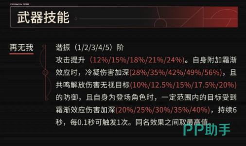 实战适配层面,灼霜高度依赖角色主动施加并维持霜渐状态的能力。所有增益均以霜渐存在为前提,若角色技能组缺乏稳定挂阶手段或无法高频触发该状态,则武器实际收益将大幅衰减。谐振等阶系统进一步放大其潜力:一阶即可获得12%攻击力加成,升至满阶后提升至24%,配合角色技能循环节奏,整体输出增幅具备显著可观性。