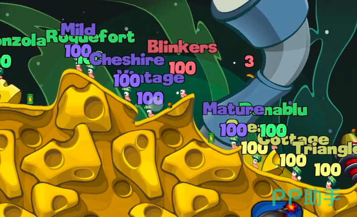第30关设定了明确的装备限制:钻头被全面禁用,不可用于挖掘或快速位移。玩家可调用的道具仅限于绳索、火箭筒、球棒及神圣手雷四类。地形方面,关卡主体为可啃食的奶酪结构,虫子可通过持续啃咬逐步向中心宝箱推进;但上方存在持续追踪的巨型“天眼”单位,具备实时视野与高威胁打击能力。推荐优先以火箭筒瞄准其头部进行精准压制,降低其侦测与攻击频率。