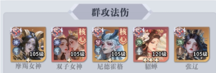 第二个阵容,大家可以玩儿的就是一个群攻法伤队,这个阵容里面大部分法伤是比较突出的,其中尼德霍格作为核心有了摩羯女神跟双子女神的双重辅助之后,大家大部分玩的都是范围攻击的情况下,就要注意前期各种控制能力在这里要先用出去,比如摩羯女神身上的各种控制,先用出去之后再加上尼德霍格的攻击才可以打出不错的效果,后期的双子女神,然后再加上其他的女神角色,对对面进行群体的输出清理的速度也是比较快的,当然如果其中缺少一些单体角色的话,一定要放一些有单体攻击的角色,这样才会保证群体输出强度足够了之后,可以产生足够的收割功能。