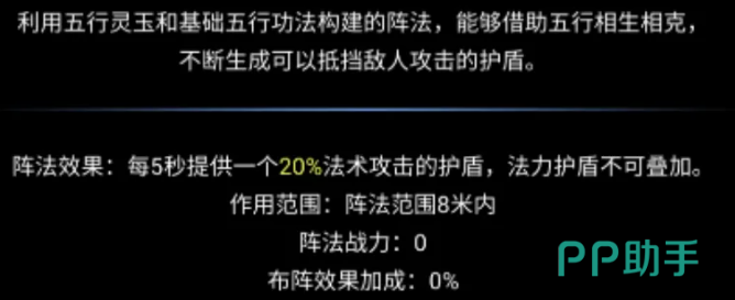 最后搭配的小五行阵在其中是没有办法带来强大的攻击,但是可以提供一个20%法术攻击的护盾能力,保护我方角色,其中是每5秒就可以生成一次护盾保护,而且护盾只要是阵法范围8米之内都可以生效,所以在这里算作是一类保护效果的阵法。