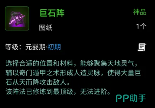 前期在金丹期之前,大家就可以看到主战界面里面,点击中间进入挂机的时候会有各种阵型选择,而阵型一般在金丹期之后大家就可以选择阵型进行搭配,那么阵法效果里面,一次是可以装备6种能力放在一起用,阵法升级的时候大家也需要在背包里面用相应的阵法图纸来进行进阶,这些搭配也是游戏当中给角色带来阵容提升效果的一类搭配,其中比较推荐大家在用巨石阵这个神品类型的阵型带来初期的加成效果,这个巨石阵目前在游戏当中带来的加成效果,是可以让大家在其中获得更多的灵气,因为其中是属于有巨石从天而降攻击敌人,只要是这个巨石阵生效的范围当中,玩家就可以拿到更多的灵脉加成,而且在这个阵法修炼到元婴初期的情况下,就无法再次进阶了,所以算作是一类神品类型的阵型,后期搭配其他阵型效果的时候,大家就可以利用金色阵型的效果来给他进行搭配。