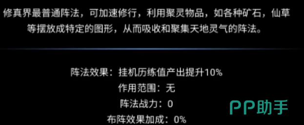 比如这里的四象诛仙阵、伏魔大阵、颠倒五行阵、次元杀阵、小五行阵加上面的这六个阵法,这样就可以形成一个阵容核心,搭配效果当中四象诛仙阵里面,大家可以看到其中是混元金斗作为核心的效果,如果是正道修士玩家用的话,在其中会有阵法加成类型的效果,所以如果大家是魔道路线的话,在这里就替换成其他类型的阵法来使用,这个阵法目前在对于生命值低于5%的敌人来说,是直接会将敌人给击杀掉,如果是精英级别以上的敌人,它的效果则会减半,而且阵法范围在10米之内都可以生效,所以还算是不错的效果,要是替换正道路线可以使用的阵型,这里建议大家挑选聚灵阵,这个阵法目前在其中是可以加速大家获取的聚灵物品,而且在挂机历练的数值当中直接可以让产出提升10%,所以是新手想要快速升阶的时候经常会用到一个阵法。