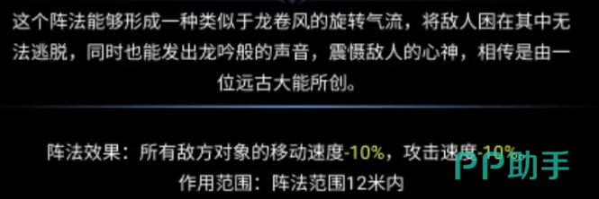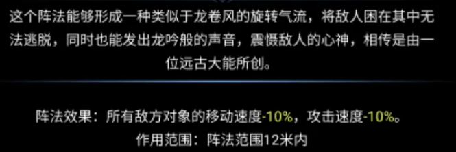 困龙阵放在这里用的话,主要是因为他的减益能力是比较强势的,在这里通过龙卷风之类的旋转气流,是可以将敌人困在一定区域当中,另外对敌人造成的输出效果是在阵法范围12米之内,可以造成这样的影响,所以在这里,这是目前几个阵法效果当中,能够打成范围最高的一个阵型,对敌人也就是说在龙卷风范围之内的敌人,可以产生移速减少10%的影响,另外在攻速上面,同样也是10%的减少,那么前期配合了此类阵型给我方带来10%增益的情况下,这里减少敌人身上属性的10%,大家可以通过阵型带来的攻击能力就更强势了,而且通过这类阵型的搭配效果,大家也可以看到,目前对于角色来说提升的攻击方式有很多,不管是给敌人施加减益还是给我方带来增益,这些阵型都可以让大家得到阵容类型的加成效果。