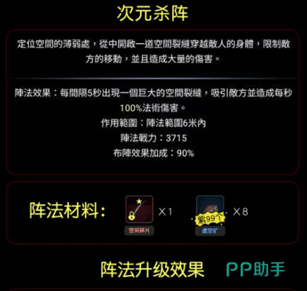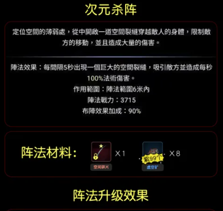 另外在次元杀阵的效果当中,大家会看到每隔5秒在场上出现的一个空间裂隙,裂隙产生一定的引怪效果,所以前期需要聚怪的情况下,这个阵法的效果大家就会可以把等级升级起来,使用之后吸引小怪进入其中,在其中每一秒的话,都会受到百分百的法术伤害效果,所以在这里大家就要注意法术类型的伤害,大家提升的不高,在这里能够带来的输出就非常的厉害,小五行阵的话,一般借用的是五行相生相克的元素效果,所以这个阵法在其中为大家带来的是一定保护的效果,其中会为大家提供一个20%法术攻击数值的护盾进行保护,这个护盾每5秒就会生成一次,而且其中法力护盾的强度是在8米范围之内,都可以为大家带来强力保护功能,但是要注意这里的护盾是不可以进行叠加的,所以只能通过这8秒的效果来进行使用,后期在阵法冷却时间结束以后,护盾会再次生成,布阵期间要注意,这个小五行阵用法是要跟其他攻击类型的阵型放在一起用。