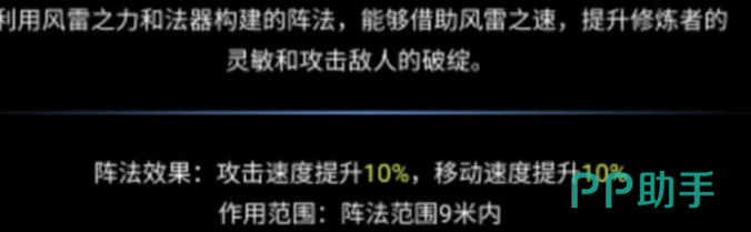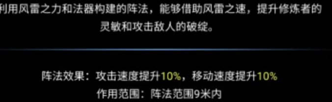 在搭配了风雷阵的情况下,大家要注意其中是要跟法器的效果搭配在一起,而且搭配的比较好,那么这里大家拿到的风雷之速会更快一些,对于主角身上的属性提升也是比较多的,此时会有灵敏属性的大幅度提升,对于攻击敌人的情况而言出现,大家在这里得到的增程越多,比如在攻击速度当中会有10%的提升,而移动速度上面也会有10%的提升,目前阵法在周围9米之内都可以产生增益的效果,所以这个阵法相对来说覆盖范围比较大的同时,能够给大家带来的增益也是比较全面的。