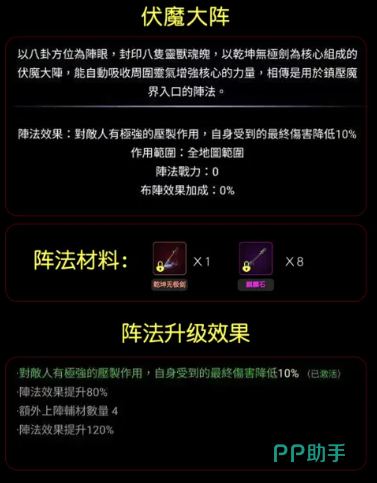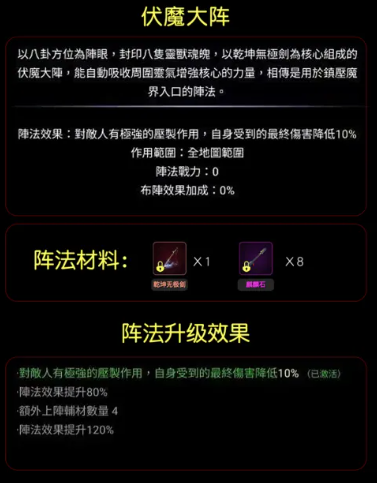 今天给大家推荐的这个阵容里面用伏魔大阵、颠倒五行阵、次元杀阵、小五行阵、风雷阵以及困龙阵来组成基础的阵容效果,其中用到的伏魔大阵,是在其中有一个范围超大的攻击效果,其中全地图的范围都可以概括到其中,而且对于敌人来说,这个阵法进行压制的情况下,我方受到敌人最终伤害数值会降低10%,而且在其中因为是用于镇压敌人的一类阵法效果,所以持续的时间也是比较久的,所以在其中大家可以当成是一类减伤效果的阵法来使用,颠倒五行阵在其中,可以通过每隔10秒触发阵法效果来对敌人进行持续两秒的攻击,当然其中有一个致命伤害是直接爆发出来10倍伤害的,但是触发的效率非常的低,只有1%,毕竟一般在10倍伤害当中,大家基本是可以一起秒杀一名敌人。