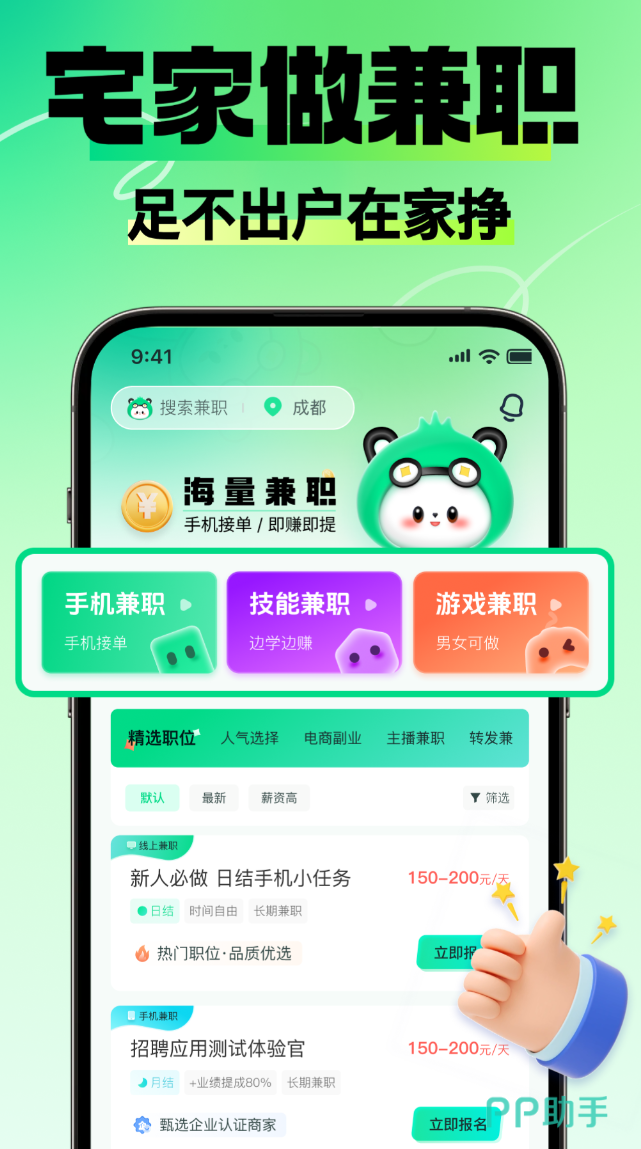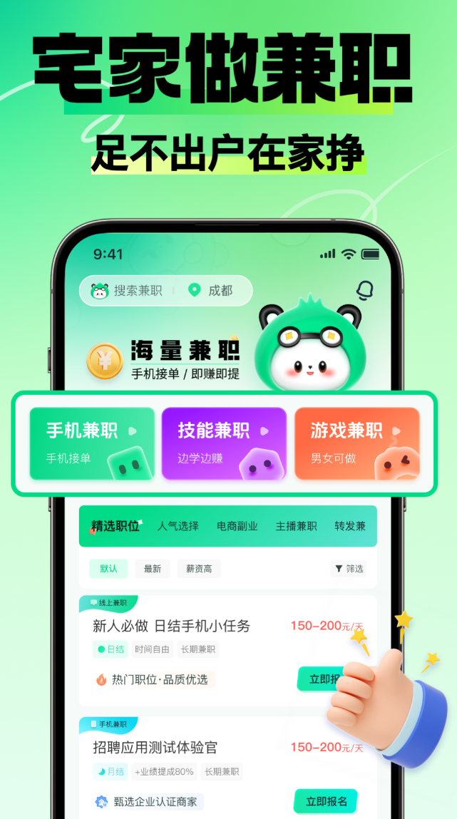 兼职类型覆盖得比较全面,网上兼职、大学生兼职、周末兼职、宅家兼职、本地兼职都有,PS、视频剪辑、作业批改、小说转发这些热门任务也能找到。商家准入机制比较严格,必须上传身份认证和营业执照,通过多重审核才能发布岗位,虚假兼职和诈骗风险从源头控制了。客服团队全天在线,遇到问题能及时解决。