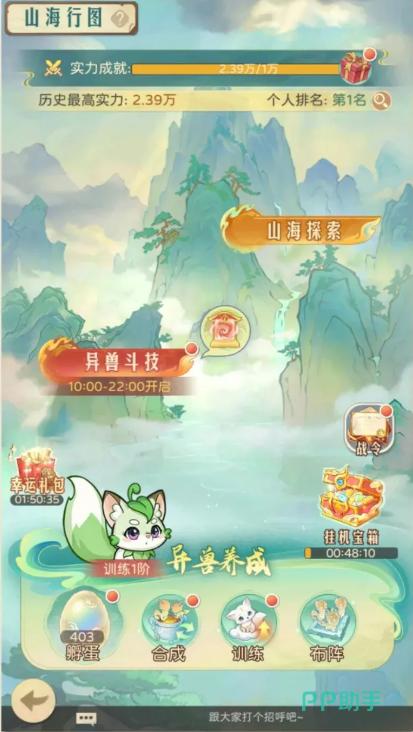 山海探索以线性章节形式展开,需按序通关。每章设有探索度目标,达成即视为通关。过程中随机触发事件,影响资源获取或异兽成长路径。同步开放的“异兽斗技”为每日限定玩法,开放时间为当日10:00至22:00;其余探索与养成操作则全天可进行。