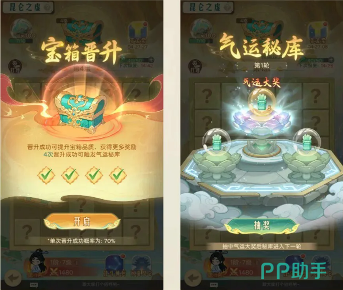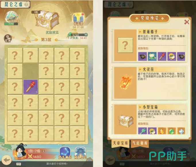 “昆仑之虚”则是高自由度的秘境闯关系统。该区域模拟天帝宝库格局,玩家消耗体力翻开格子获取奖励,部分格子需更高体力投入。每层地图由多个格子组成,其中隐藏“终极宝箱”——它不仅提供丰厚奖励,更承载通往下一层的唯一入口。宝箱所占格子数量不一,玩家需规划最优翻格路径,以最大化层数突破效率。首次发现终极宝箱后,可进行共4次品质晋升,每次晋升均提升宝箱内奖励稀有度与价值。