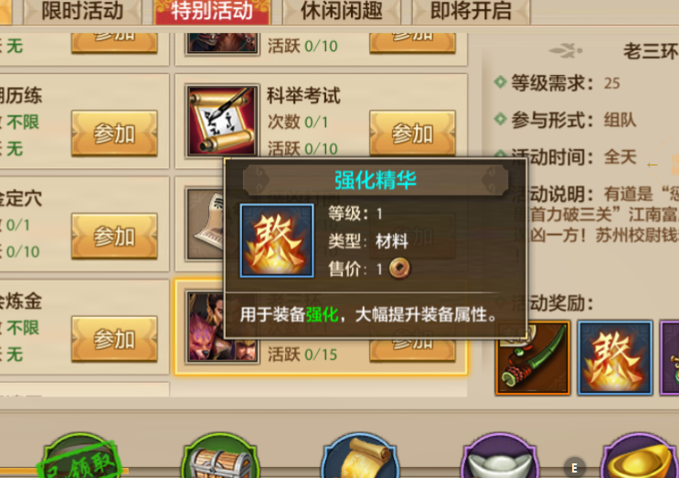 强化精华:玩家的装备想要做好提升,强化是最为基础的一个玩法,而强化就需要强化精华来消耗。随着装备强化等级的提升,需要的强化精华也更多,通过老三环副本可以获得很多的日常收益,而且这个收益还是根据角色的战斗屏风来发放的。