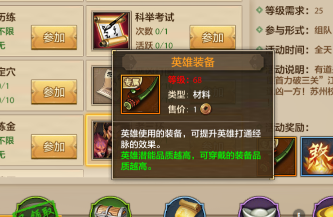 英雄装备:这个是游戏中英雄使用的装备,不是角色装备。而且使用的等级也比较高,需要英雄达到68级的时候才可以使用。这个装备的主要能力就是提升英雄大同经脉的效果,简单来说就是增加指点技能的效果能力,让玩家的角色技能伤害或者说效果更加的强大。该装备掉率不是很高,需要有一定的运气才可以得到。