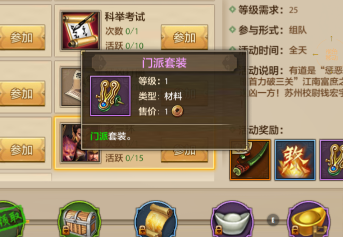 门派套装:这个是紫色品级的装备,在前中期还是有不错战力提升的。掉落出来的装备是门派专属,其他的职业是无法使用的。在掉率方面,小编个人觉得是比较不错的,基本上一次就可以掉落一个,只是重复率有一点高,筹齐一套需要一定时间。