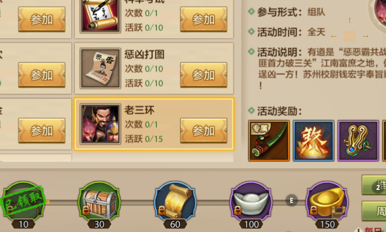 参与老三环需要玩家的角色等级达到25级,同时还需要组成两或者以上的小队来参与,单人是无法进入的。这个活动是全天开放的,达到要求之后随时都可以进入。每日可以挑战一次,之后还能够使用元宝来购买一次次数。