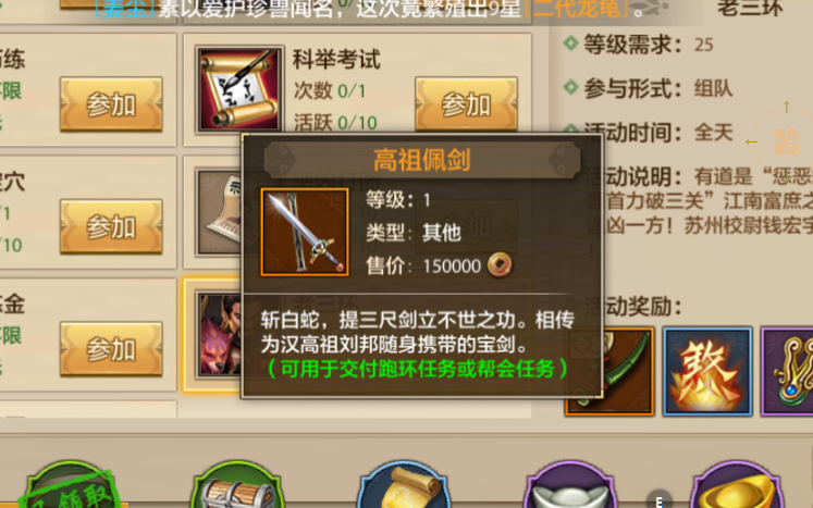 高祖佩剑:这个是一个任务道具,可以在跑环任务和帮会任务中提交,提交佩剑道具获得的收益是最高的。该道具在副本中的掉率也还行,基本上一次就有一个。