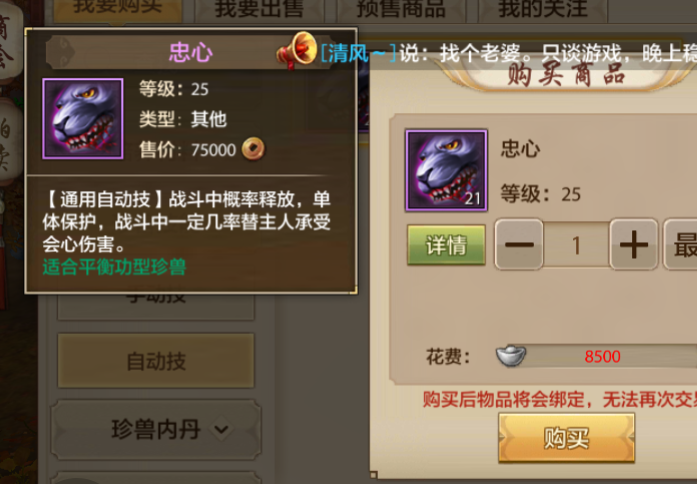 第三个技能“忠心”,忠心技能在战斗中会有一定的几率为主人抵挡会心伤害,触发之后本次的会心伤害完全由珍兽吸收,在PK 玩法中是一个神技,但是等级最好高一点,才会有不错的触发几率。