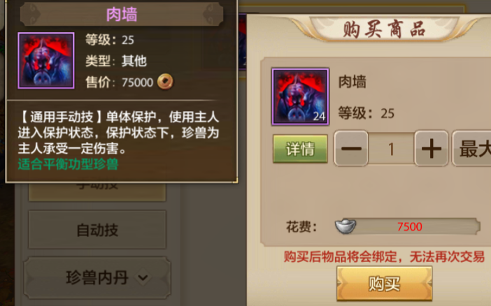 第二个是“肉墙”,该技能在主动使用之后珍兽会保护主人,进入保护状态之后受到的伤害减少,大部分的伤害都会被珍兽给吸收掉。但是在珍兽血量低于20%的时候无法使用。该技能可以很好的保护峨眉,尤其是在PK玩法中,突后排的敌人很多,峨眉的生存能力会有一定的保障。