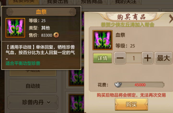 手动技能:手动技能的选择主要有两个,第一个是“血祭”,该技能可以消耗珍兽部分的血量,为角色提供一定的气也就是蓝量的恢复。大家都知道峨眉是一个辅助职业,而辅助能力来源于技能。频繁使用技能就会缺蓝,有了血祭之后就可以很好的弥补这方面的消耗。