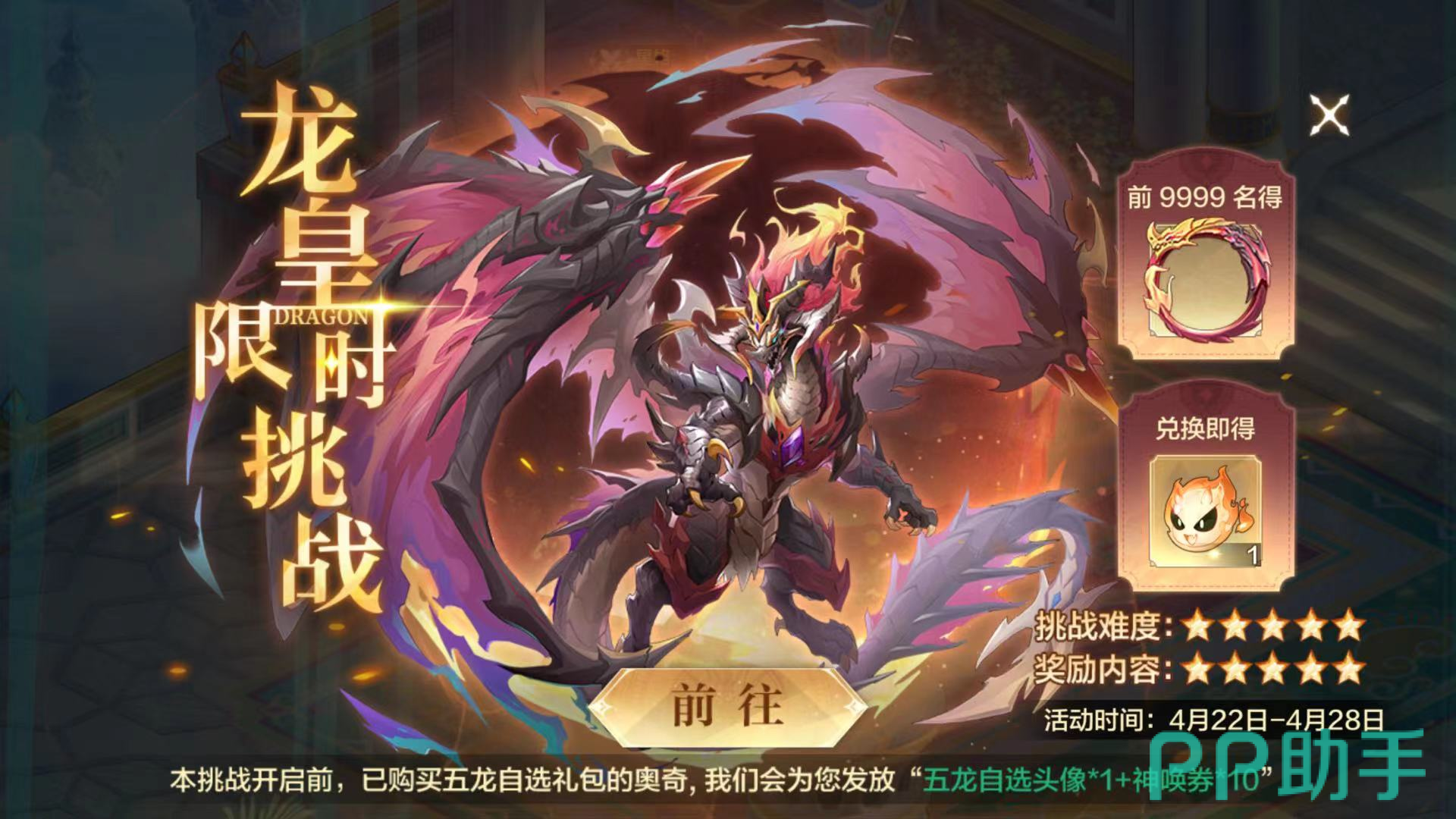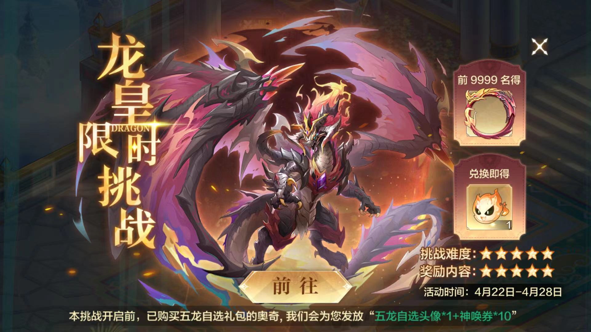 进入游戏后,可以看到龙皇限时挑战赛,活动时间:4月22日-4月28日,还可以通过挑战前购买五龙自选礼包的奥奇,我们会为您发放“五龙自选头像*1+神唤券*10”,挑战难度和奖励内容都是五星。当前9999名赤焰征服者可以获取30天专属头像框,限时为30天,征服赤焰龙皇的英雄,威名会传遍寰宇。觉醒时可以代替1只传说同名精灵,每一颗觉醒之魂,都承载着奥奇的奇迹。