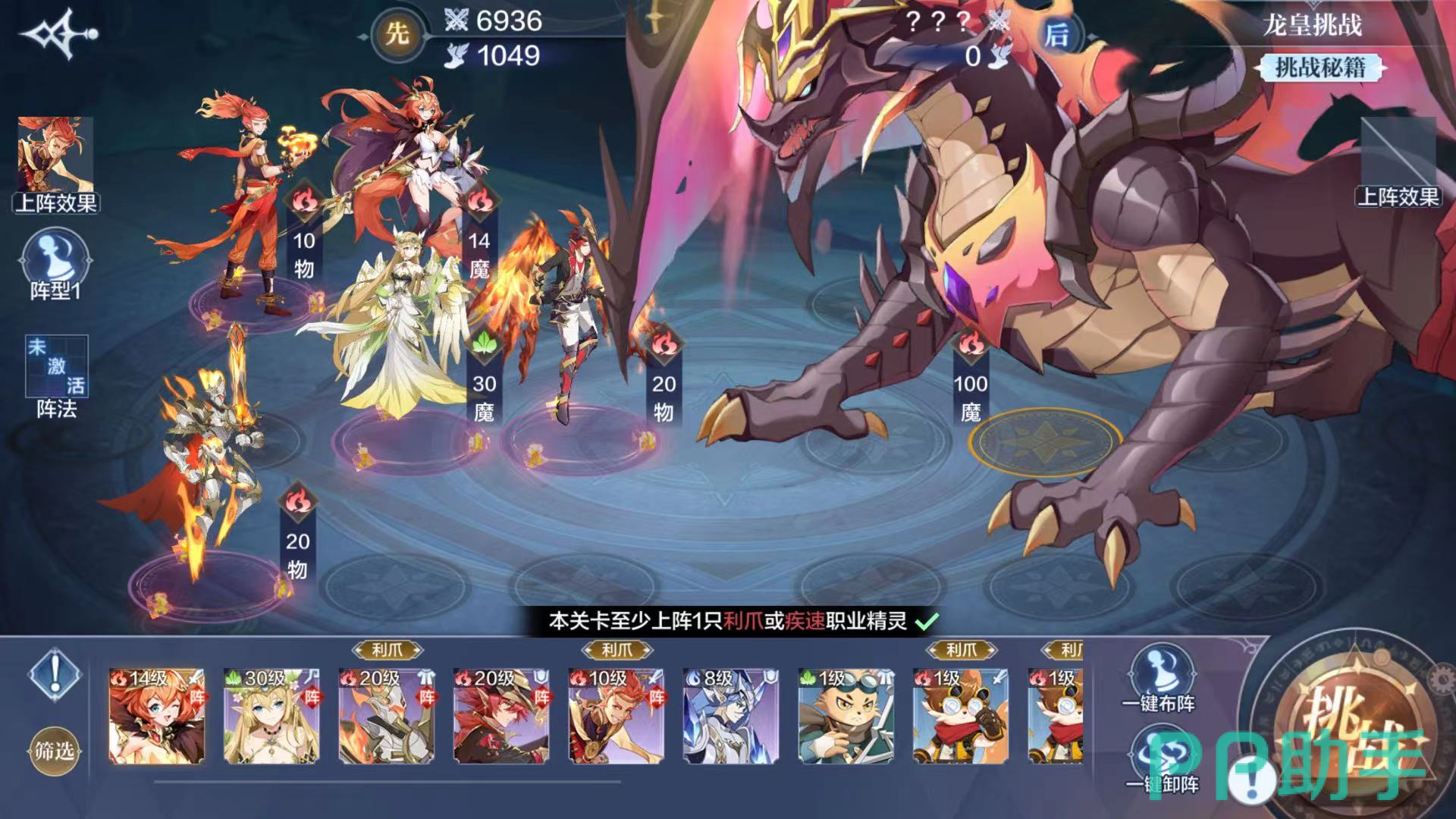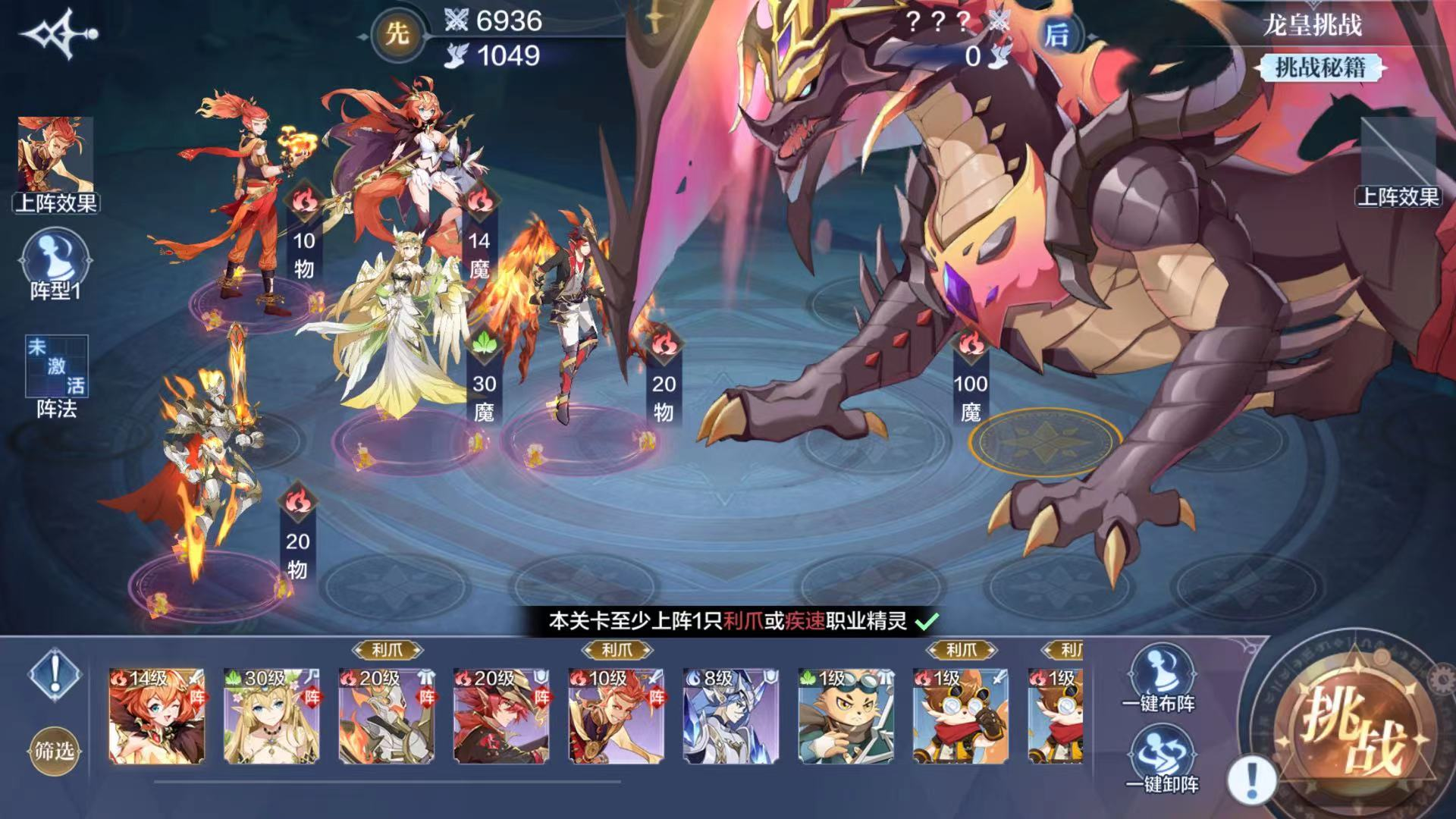 点击前进后,可以看到活动说明,每天可进行三次挑战,每次挑战战斗是5轮,根据5轮累积总伤害结算奖励,还会重置进度,点击进入挑战,开始战斗,可以选择一键布阵进行挑战,还可以通过选择阵型变化不同的战斗阵容进行挑战,当挑战成功后,可以成功获得赤焰龙皇坐骑。