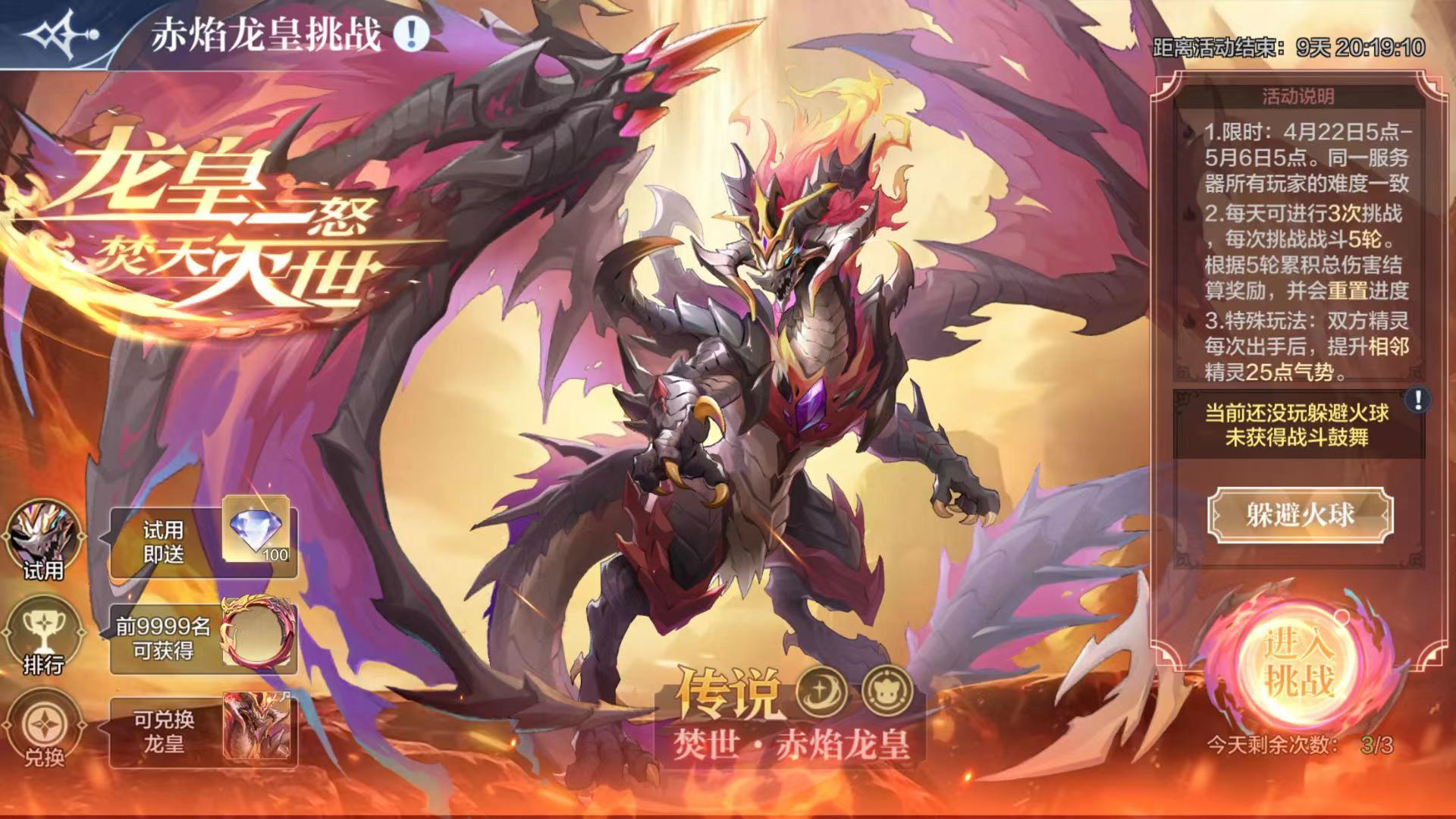在兑换商店可以兑换赤焰黄龙精灵,兑换后可以在精灵背包中进行展示并晒出自己获得的名次,每次挑战需要玩躲避火球小游戏,可以增加战斗鼓舞,获得战力提升。