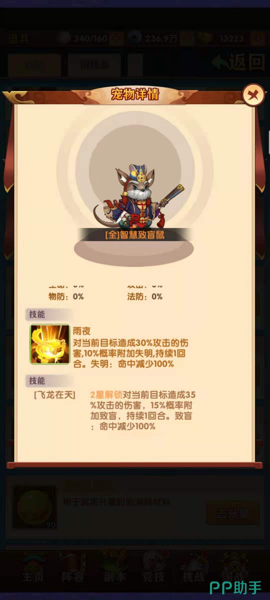 功夫降怒猫的技能是雷暴,效果是对当前的单体目标造成伤害,并且有几率降低对方的怒气,怒气是释放技能的基础,没有怒气就无法释放大招了。智慧致盲鼠的技能是雨夜,效果是对当前的目标造成伤害,并且有10%的概率造成目标失明,被失明的目标攻击会丢失。雪域眩晕熊的技能是重晕斩,效果是造成伤害的同时,有5%的几率附加眩晕,被眩晕的目标无法行动。