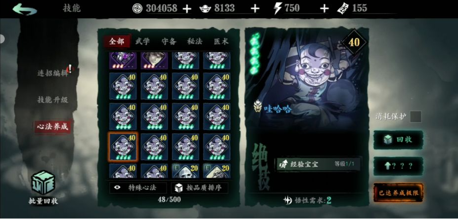 而对于提升绝技和升华无望的心法,进行心法回收则是大势所趋,点击不用的心法,在右侧会有回收的字样,单个回收可以预先查看回收所能获得的材料,当然也可在左下角批量进行回收。