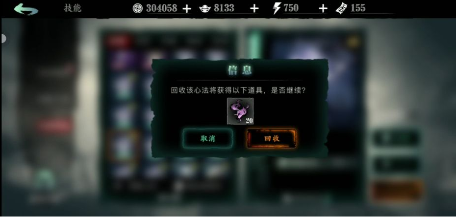 点击回收后会提醒是否确认回收,这里要多留意不要把有用的心法不小心回收掉,资质较差也就是我们大多数批量回收的心法都会给我们记忆气息,这可以为我们有用的心法进行进阶。
