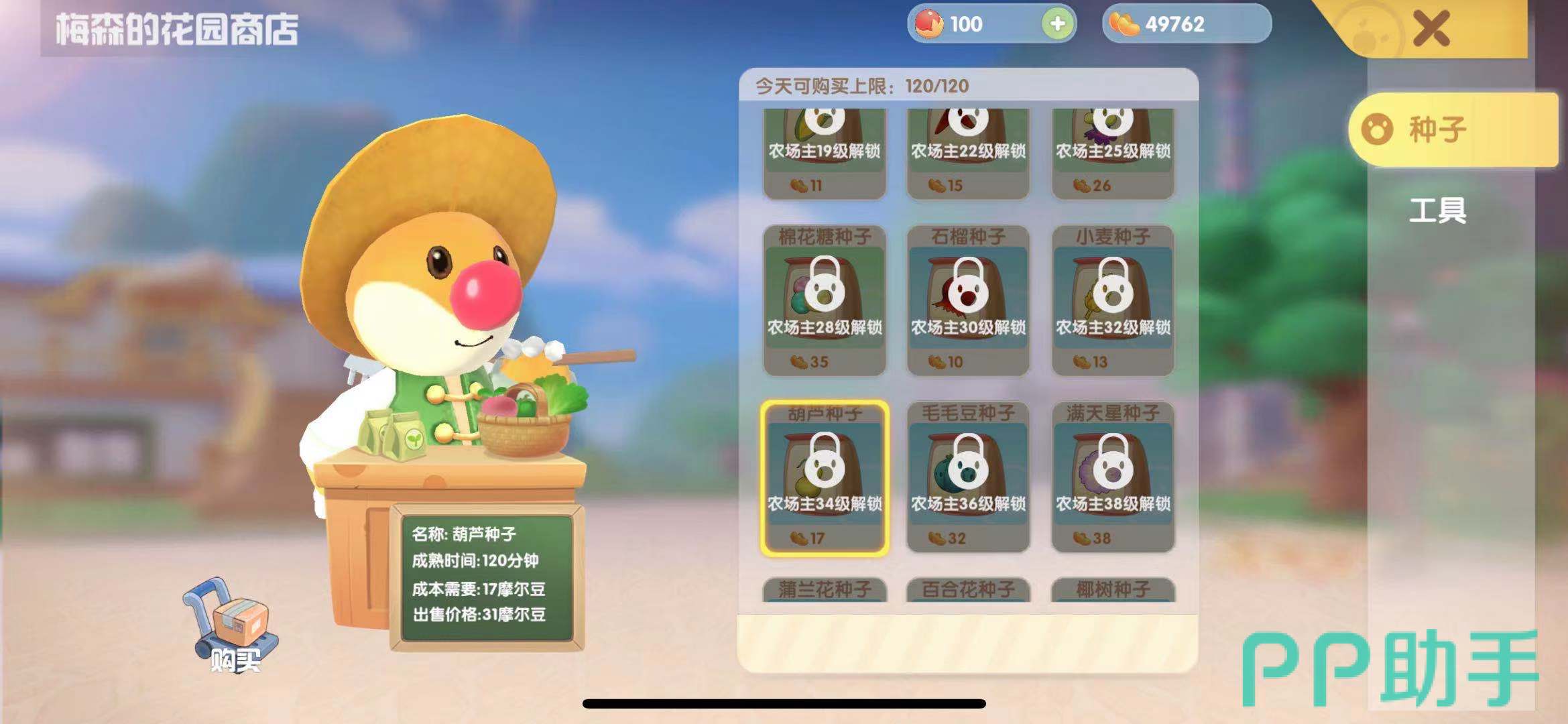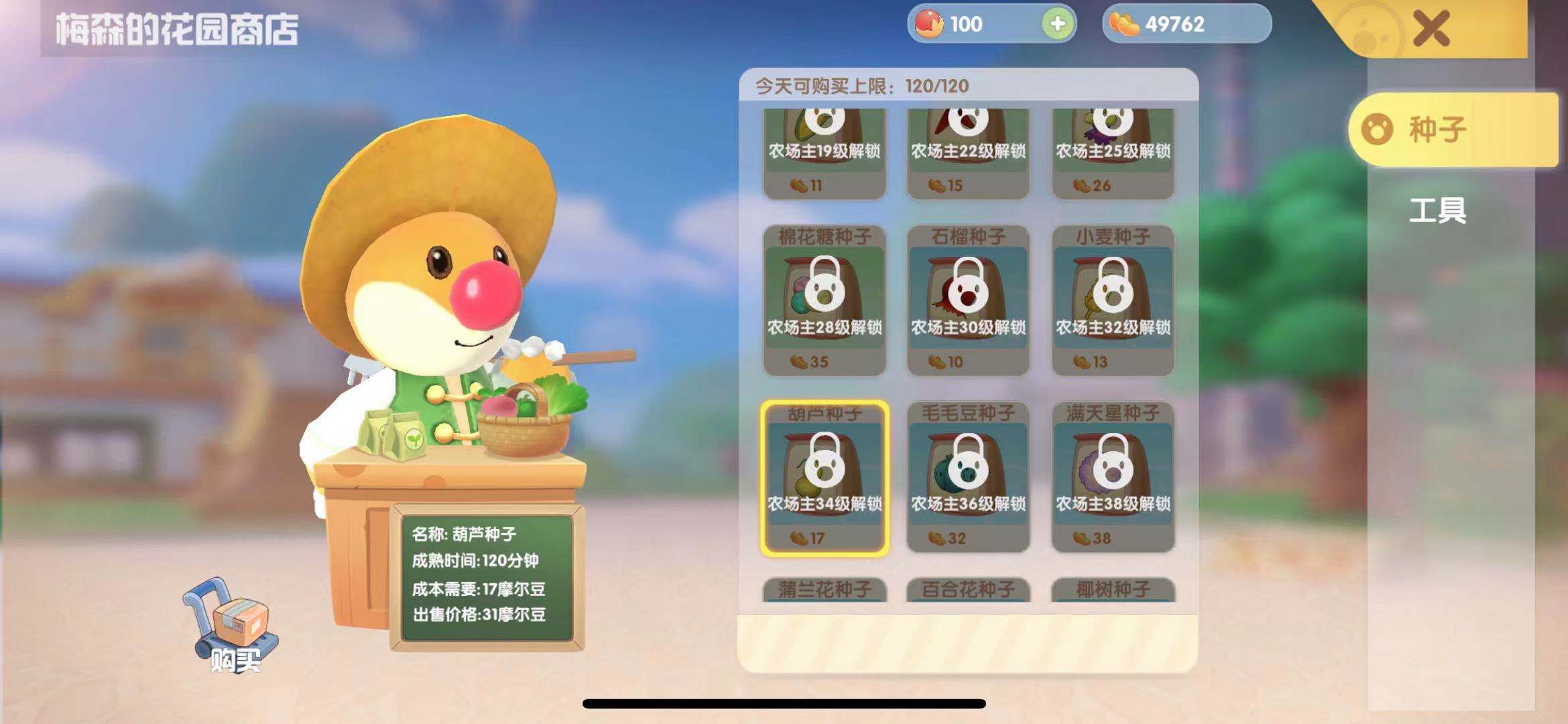 葫芦具体的获得方法是,在玩家农场主职业等级达到34级的时候,可以在梅森的种子店解锁,并且进行购买。也可以在前期等级还不够的时候我们可以去等级比较高的好友那里进行偷菜,只要他种植了葫芦成熟后我们就可以获取一些,需要注意的是要赶在其他玩家偷菜之前先去,要注意下成熟时间,赶在第一时间达到比较容易获取到葫芦。