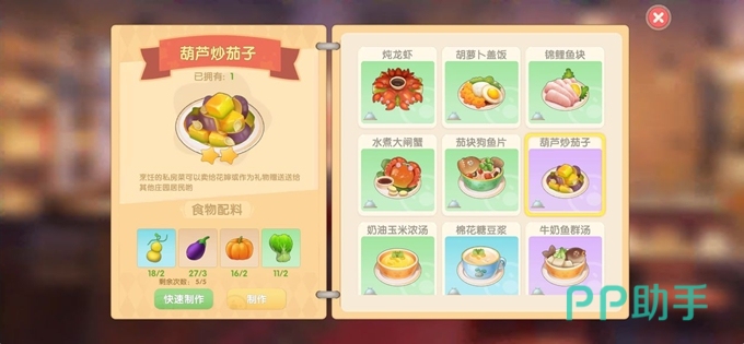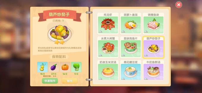另外有个葫芦之后我们就可以去厨房开发出新的菜谱,一个是葫芦抄茄子需要葫芦+茄子+白菜+南瓜就可以开发出来,还有一个是清炒毛毛豆,需要葫芦+奇异果+毛毛豆。有了这两个菜品可以更好的吸引顾客前来购买。