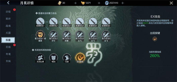 月英的无双乱舞技能可以将能量汇聚在武器周围,然后重重砸向地面,并召唤泰山压顶击溃敌军,总计造成720%攻击力的伤害。其EX攻击技能可以高举武器,召唤雷电轰击周围敌军,总计造成260%攻击力的伤害,并且有概率使敌人感电。她的蓄力攻击2、3、以及6都有一定概率能够使敌人进入感电状态。而且蓄力攻击4、5、6都对敌人有击飞效果。