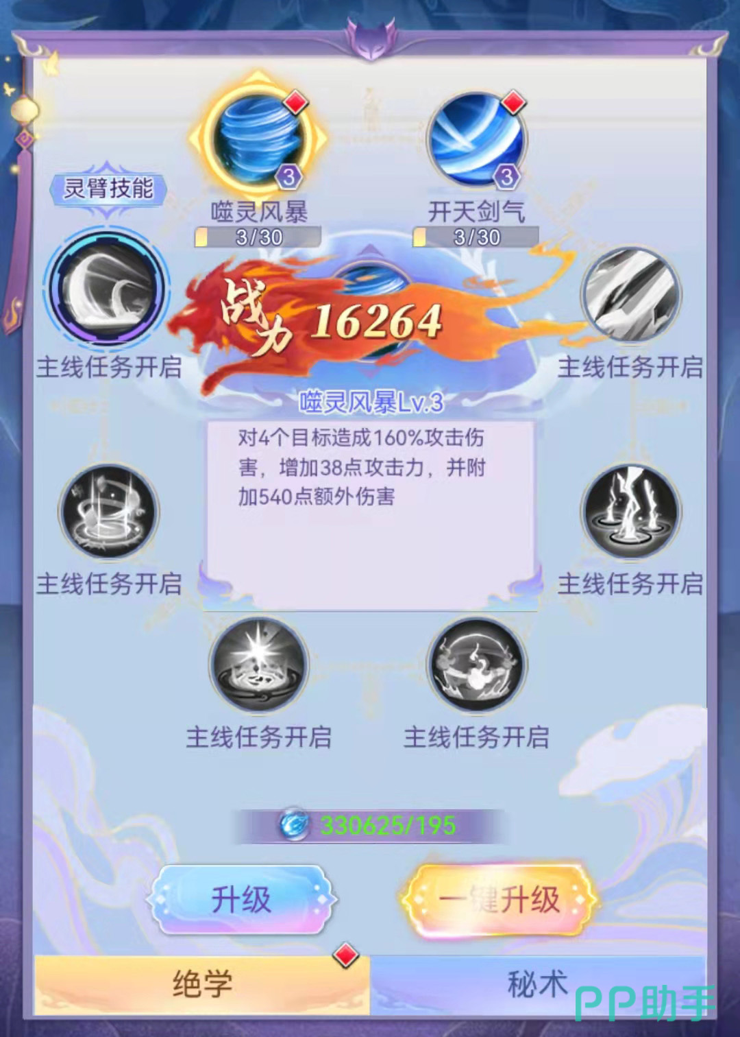 前期的话,大家可以学开天剑气这个技能。能够对敌人造成高额的输出并增加攻击力,还有噬灵风暴,能够对多个目标造成高额伤害,并附加额外输出。至于其他的技能的话,还需要慢慢的解锁,可以通过做主线任务的方式去获得。想要提升技能强度的话,点击升级即可。