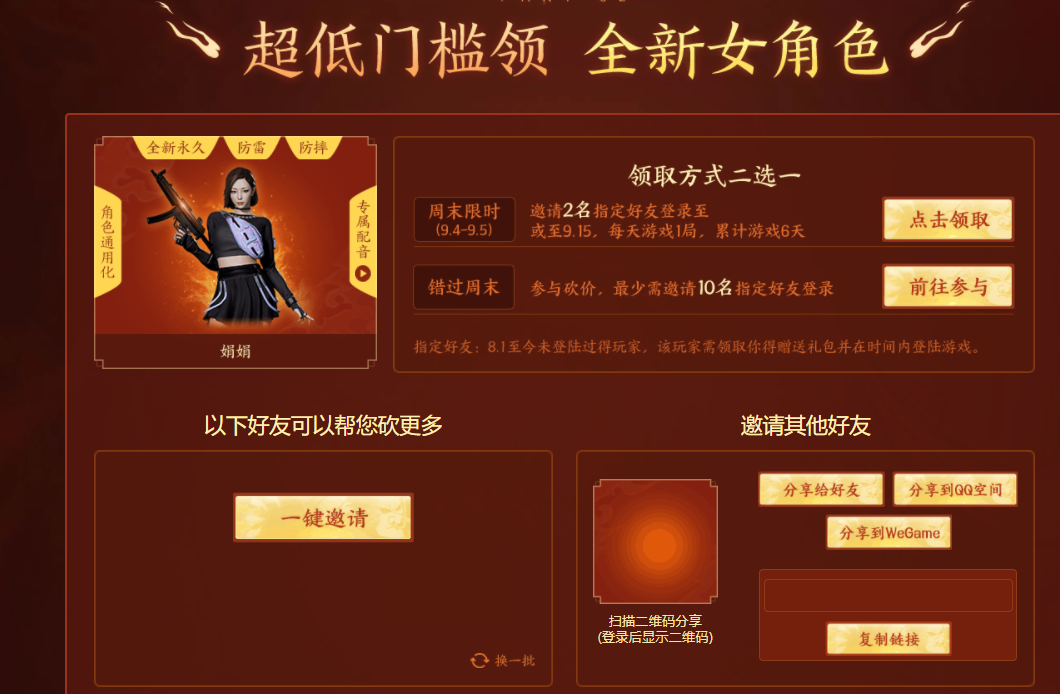 周末限时邀请2个特定好友登录(9.4-9.5)或9.15,每天玩1场,共玩6天。