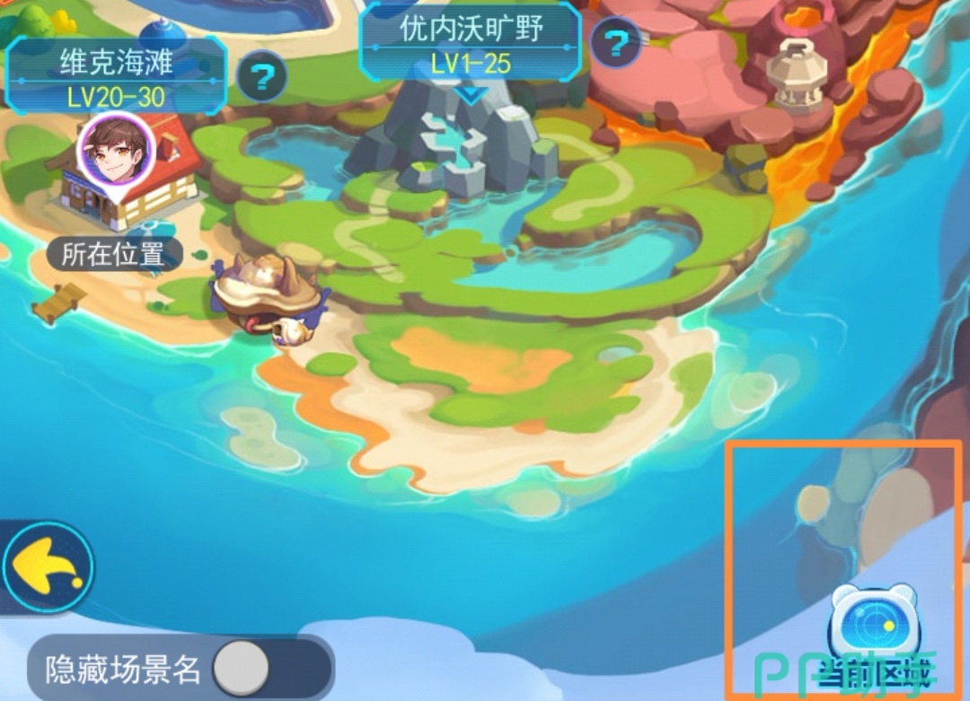 玩家到达了[维克海滩]后,点击右上角的地图后,再接着点击如下图所示的“当前区域”这一位置,玩家就会在区域地图的左上角发现[精灵之森]了,拥有水系徽章的玩家可以直接通过地图到达这一地点。