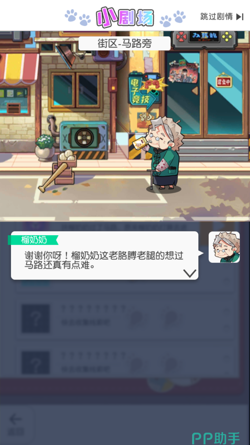 过马路任务接取之后小伙伴们还需要过几次主线任务,这样才能让任务刷新,任务刷新之后我们前往街区并将视角拉到最下面。这里我们可以看到榴奶奶在马路的对面并且还说要过去,我们用手指按住榴奶奶并把她向马路对面拖动,拖到马路对面就能过完这个任务了,是不是很简单呢?送到马路对面之后榴奶奶会给我们一点奖励,并说一会儿去她的摊位来。