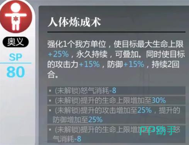 首先玩家们要理解技能,人体炼成术的机制,人体炼成术可以强化1个我方单位,使目标最大成命值上限+ 25%,永久持续,可加乙已方角色的功攻劫击力+十15%,防御+ 15%,持续两回合。解锁了附属属性后,还会有更高的提升。