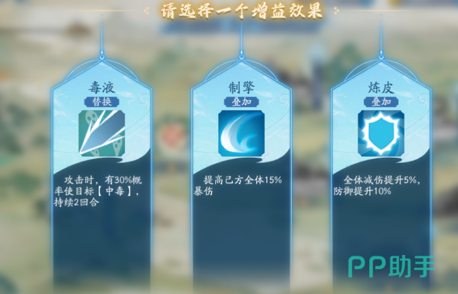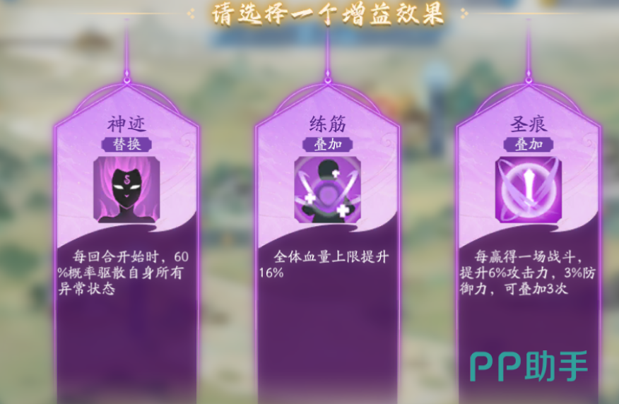 再来就是一些特殊设定的讲解,在每次通过敌人的考验之后都可以选择一个增益效果来提升侠客能力,系统会随机提供三个增益效果,玩家可以自由选择。增益效果是很多的,大家要合理选择。这里要注意增益效果是分为叠加、替换和唯一的。叠加的话是可以通过品级颜色来叠加的,替换就是选择同样能力不同品级会进行替换,而唯一的是橙色增益,这个只能够选择一个来提升。