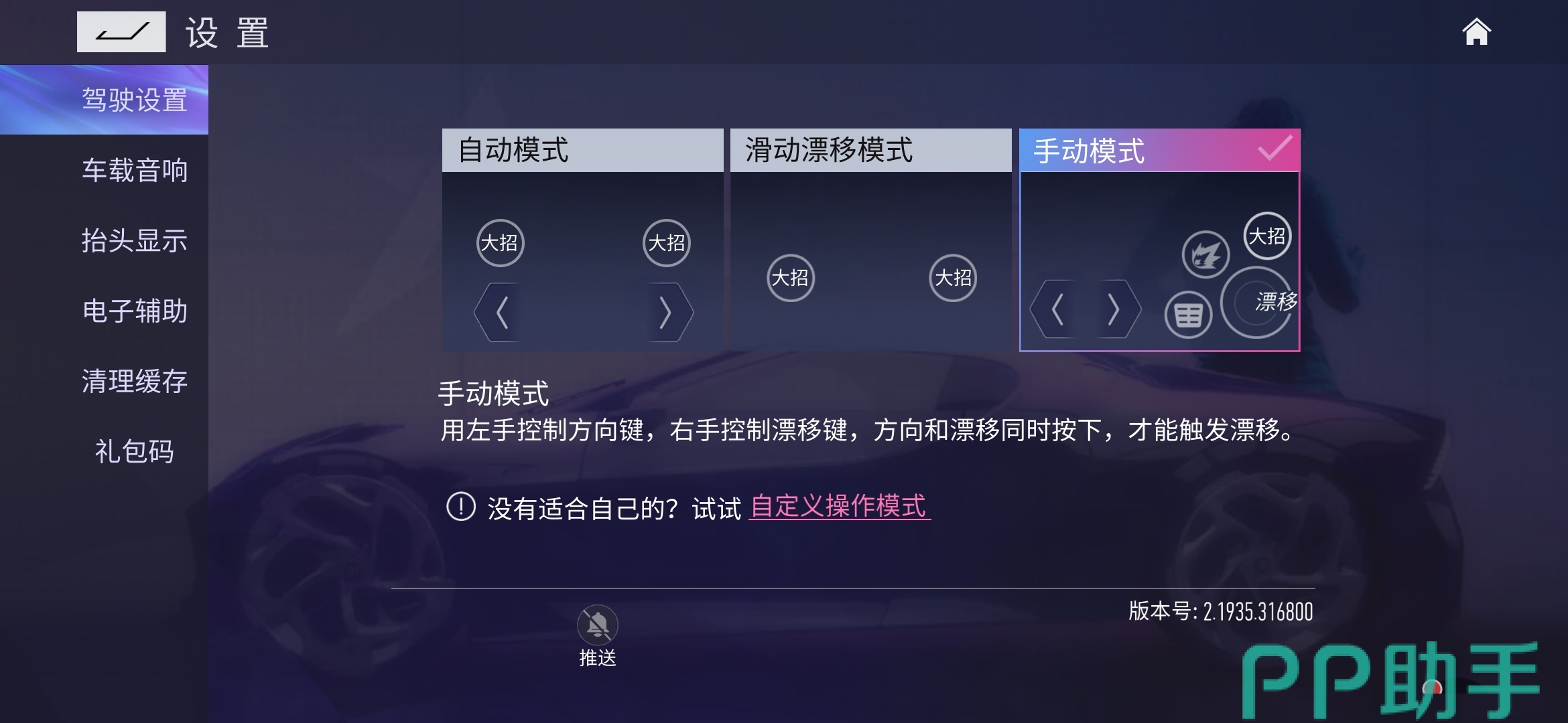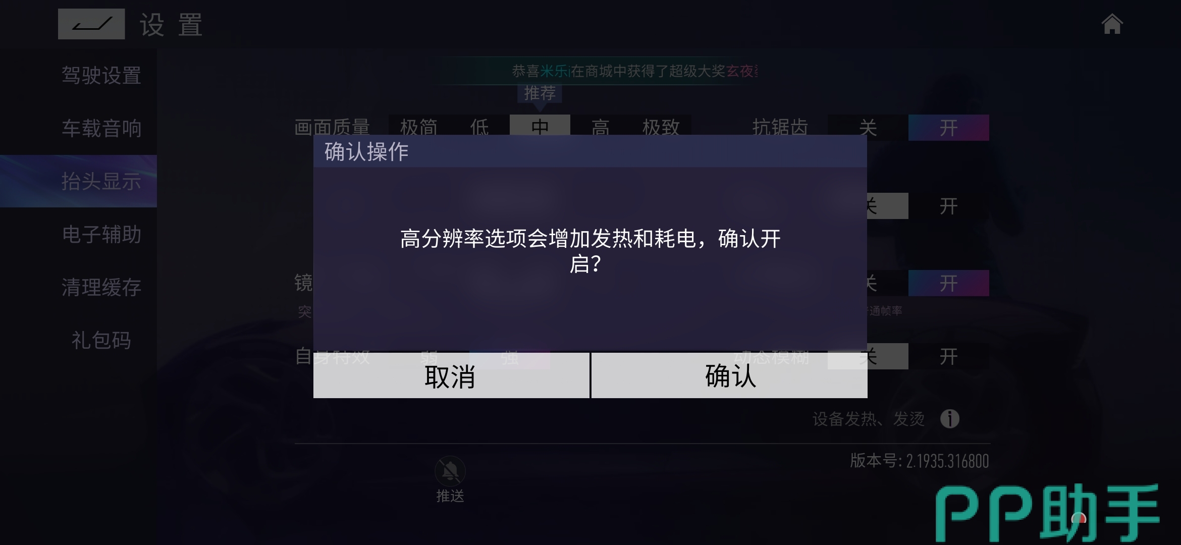 2、进入游戏设置页面可以看到“驾驶设置”、“车载音响”、“抬头显示”、“电子辅助”等几个选项,画质调整的功能就在第三个“抬头显示”中,我们点击“抬头显示”功能设置选项。