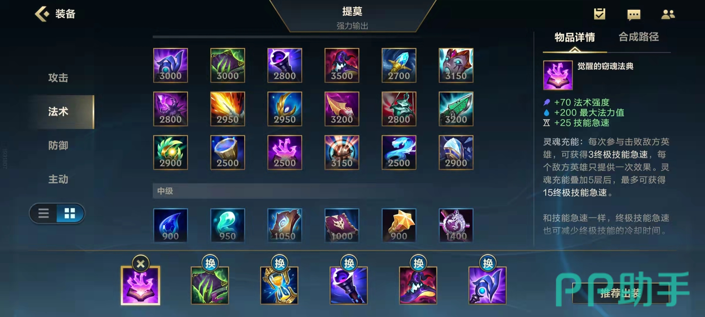 提莫的出装都是法强出装,为的就是提升提莫技能的伤害,尤其是大招。此外卢登、CD鞋和窃魂法典为提莫提供60额技能急速,大大削减提莫大招技能的CD,可以部署更多的蘑菇。此外灵魂法典还可以为提莫提供额外15点技能急速,不过需要击杀对手每个英雄来叠加。有了CD还不够,需要帽子、法穿棒和鬼书来提升提莫的蘑菇伤害,帽子将大幅提升提莫的法术强度面板,法穿棒提升提莫的法穿属性,鬼书则用于克制对手的续航,要是对手的续航不强就换成无限宝珠,让提莫的技能造成暴击,提升技能伤害。