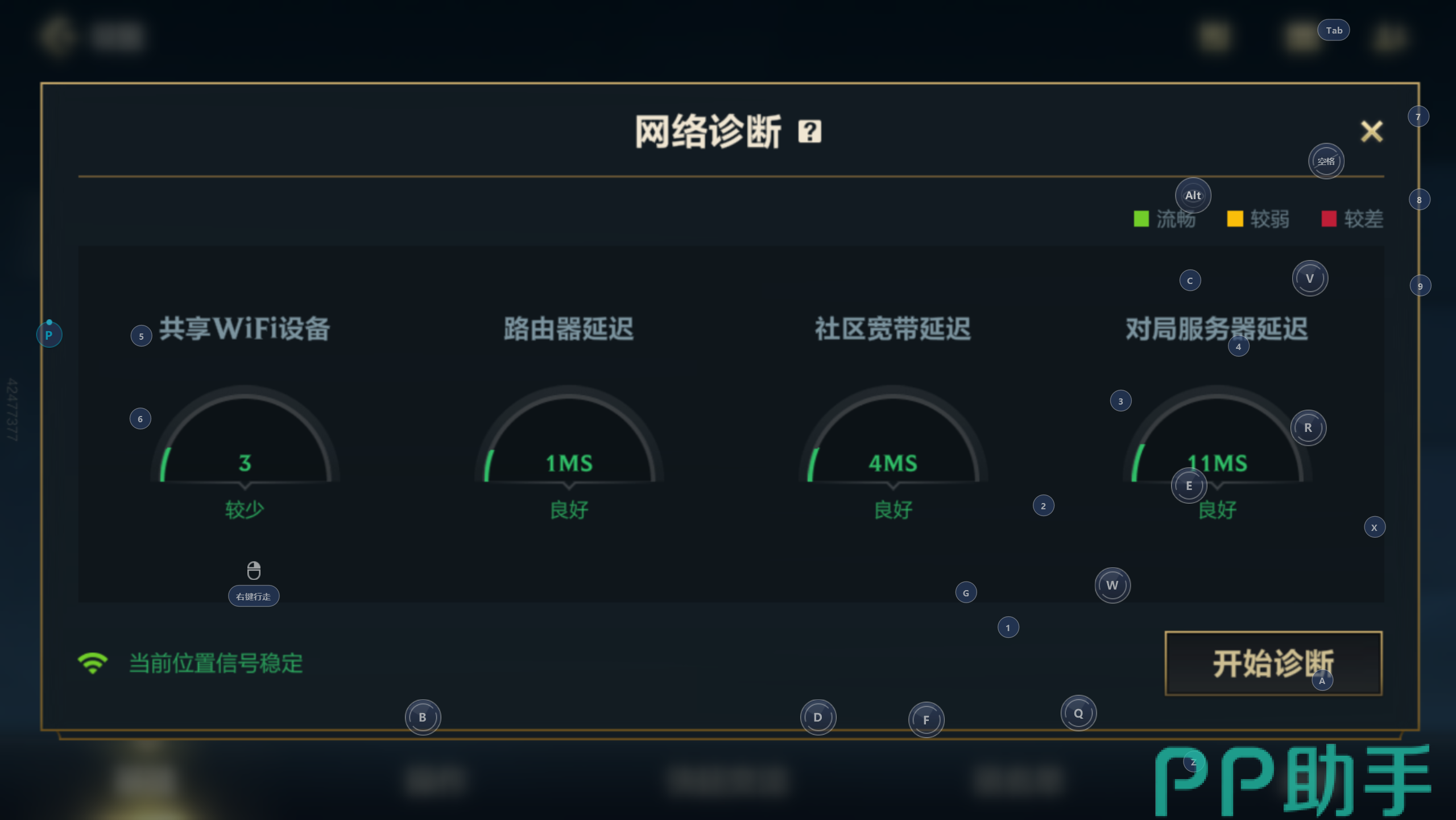 我们进入游戏之后先点击右上角的网络质量按钮,如果延迟在50ms左右的话那就是正常的,不是的话我们就要点开设置中的网络诊断按钮了。这个功能会对我们的网络有一个全面的检测,检测完毕之后小伙伴们就可以知道网络的问题出在哪一个环节了,之后切换网络就能流畅的进行游戏了。